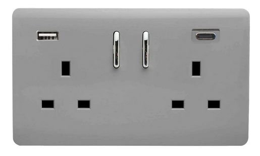 The Trendi Switch range of 2 gang 13 amp USB plug sockets comprise of a sleek chrome rocker switch on a "screwless" plate displaying the complete colour of the products. This is supported by a back frame that houses the screw holes & module for the product to be installed into compatible back boxes and wiring.