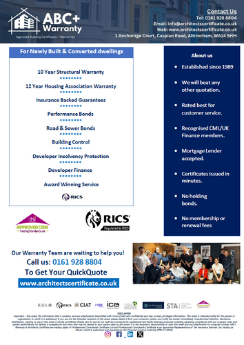 ABC+ Warranty is the UK's most cost-effective structural warranty company. Choose from our two award-winning options; A 10/12 - year structural warranty or a 6-year mortgage lender approved certificate (PCC).