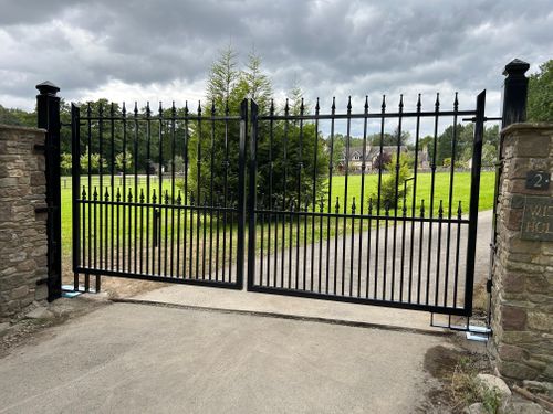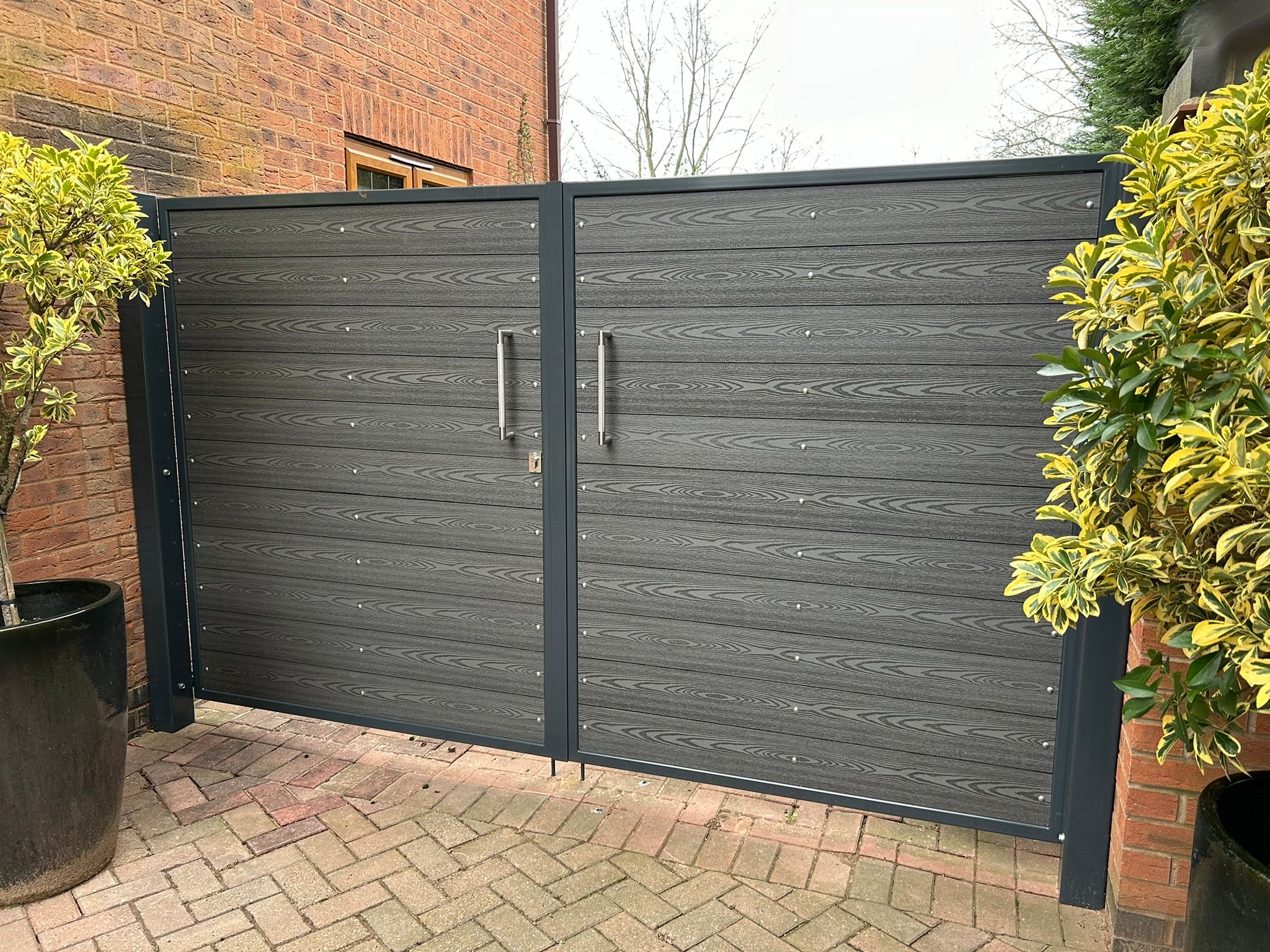 Bespoke, handmade to measure steel framed composie boarded gates.The metal work has a 3 parts process:1. Shot blasting2. Zinc primer3. Finished in powder coat