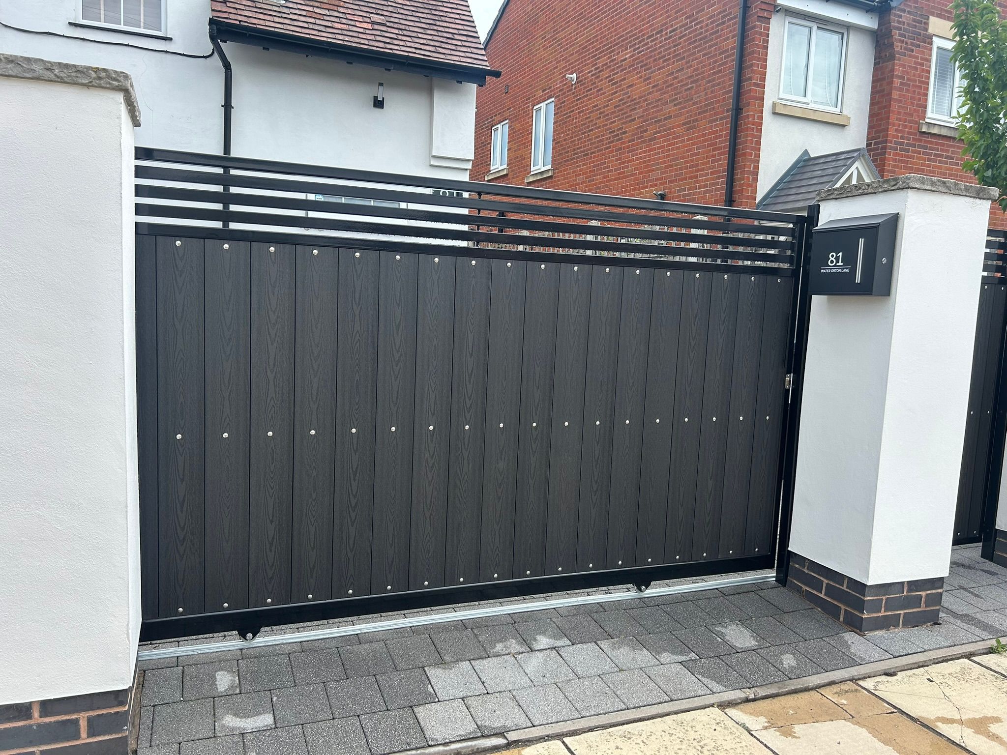 Hybrid black ash sliding composite gate with matching single gate and bespoke panels.