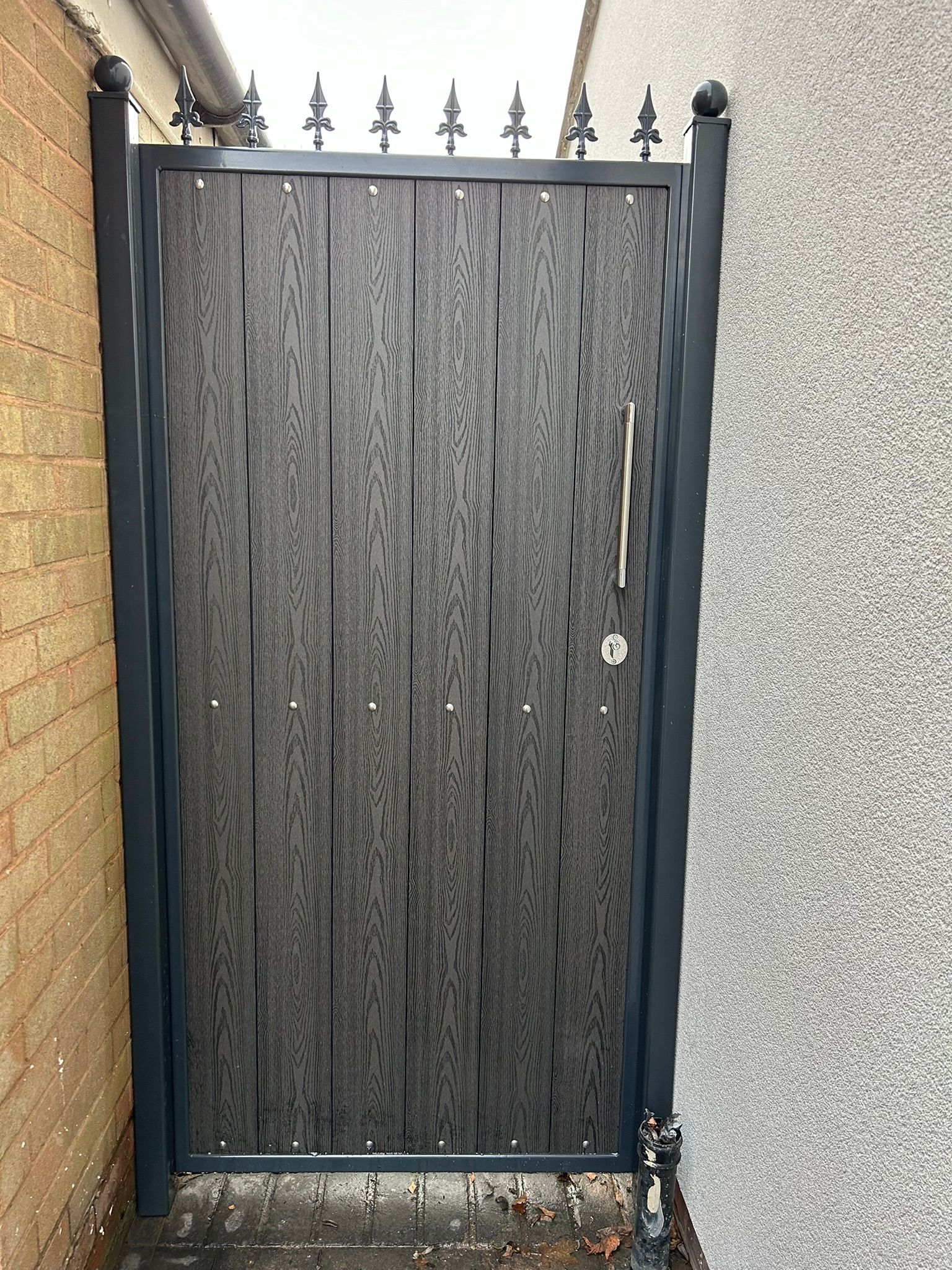 Anthracite grey single composite gates with boards either fitted vertically or horizontally.